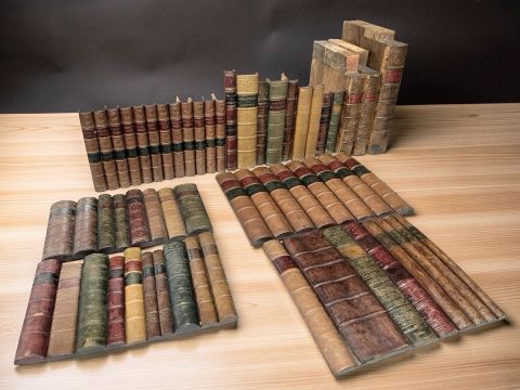 A collection of decorative faux book spines, tallest 26 cm.