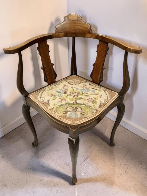 An Edwardian inlaid walnut corner armchair with tapestry seat.