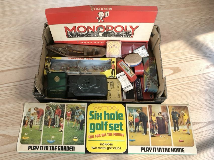 Assorted toys and games, Webley six hole golf set game in box, Tri-Ang minic wind-up model tank with key, dominoes, Crescent Toys Native American figurine set, etc. (1 box)