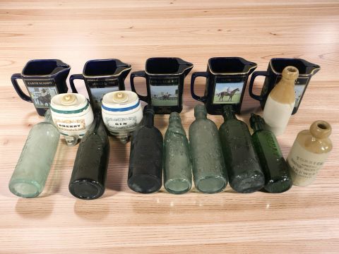A group of glass bottles including J Kershaw & Sons, Gateshead, five Seton Pottery jugs, two ceramic gin and sherry barrels, stoneware bottles. (1 box)