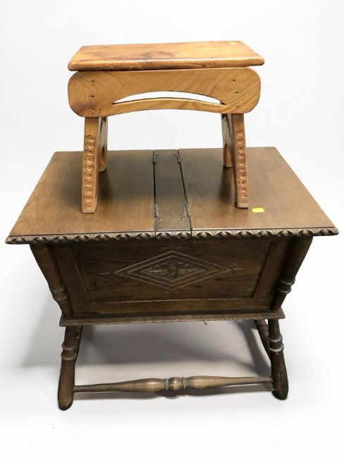 A 20th century oak work box, width 65 cm, together with a stool.