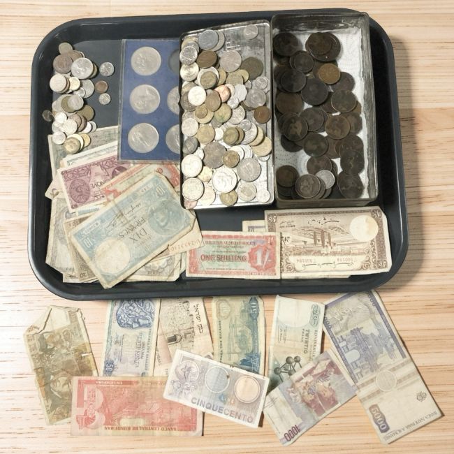 A collection Georgian and later coins including a cartwheel two pence 1797, various Victorian pennies, pre-decimal, and assorted world bank notes.