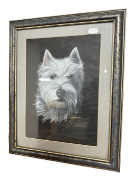 Contemporary School : A pair of pastel studies of dogs, indistinctly signed and dated '97, each 28 cm x 21 cm, together with a print after Coulson depicting a steam engine.