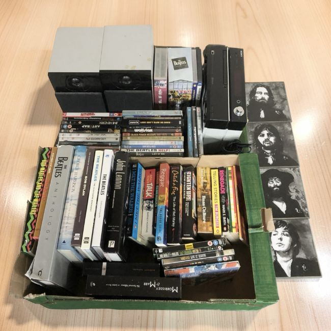 A Sony micro hi-fi component system, pair of speakers, various DVDs, books relating to The Beatles, etc. (2 boxes)