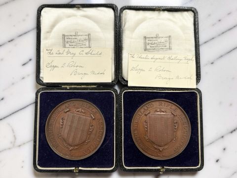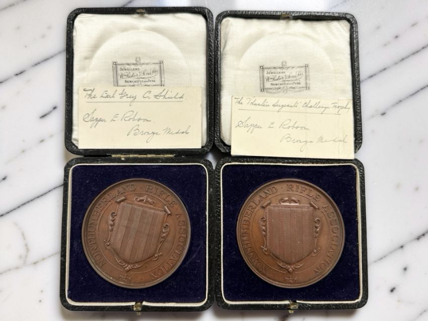 Two Territorial Service Rifle Championship of Northumberland bronze medals, won by Sapper E Robson, Electrical Engineers, 1928, both extremely fine, 63mm, in original velvet-lined cases.