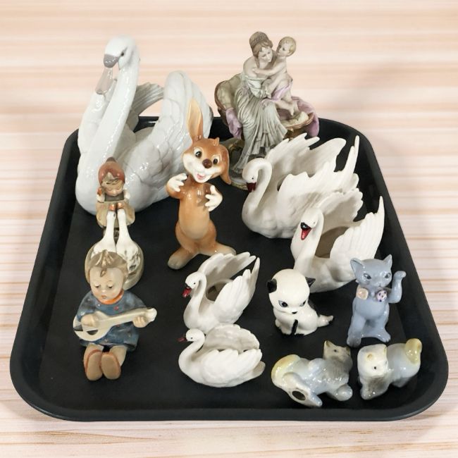 Four graduated Goebel swan candle holders, together with a Lladro figure of a swan, No. 5231, Goebel boy and girl figures, Capodimonte bisque porcelain figure of a lady and child, etc.