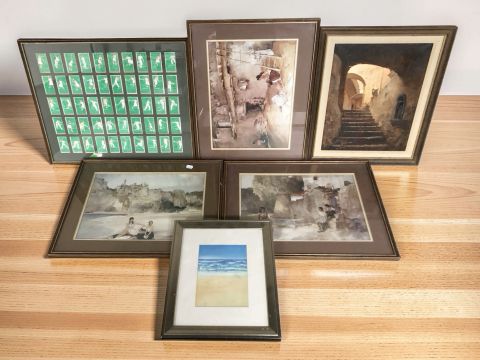 A group of pictures and prints including three prints after William Russell Flint, montage of John Player tennis cigarette cards, oil on canvas of a continental street, etc.