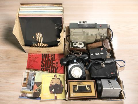 A bakelite telephone, various cameras including Kodak, Halina, vintage cash tin, small quantity of vinyl records, etc. (1 box)