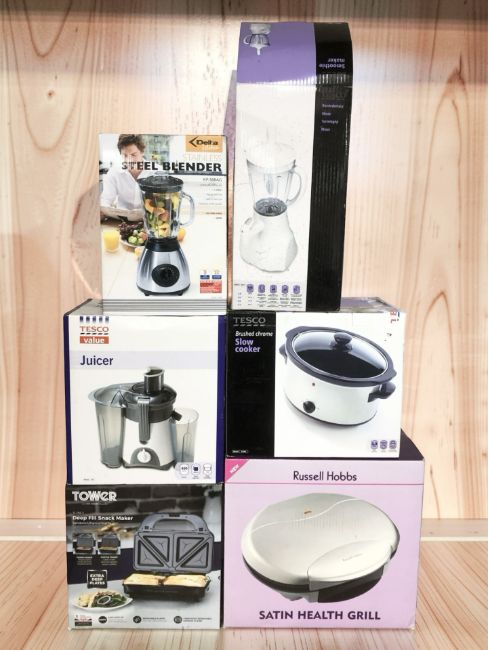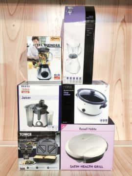 A group of boxed kitchen electricals including sandwich maker, slow cooker, blender, juicer, etc.