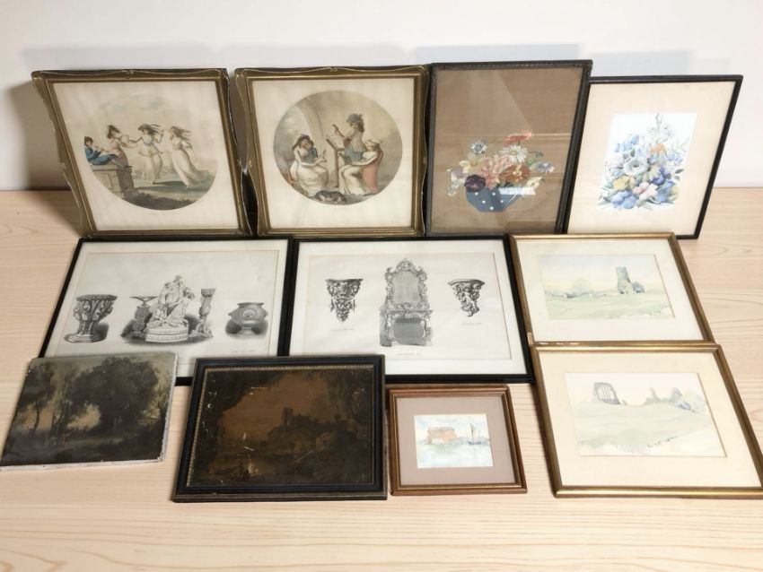 A small group of pictures and prints including a pair of hand coloured stipple engravings after Francesco Bartolozzi titled 'The Dance' and 'Music', each 23 cm diameter, together with various watercolour studies, needlework picture, prints, etc. (1 box)