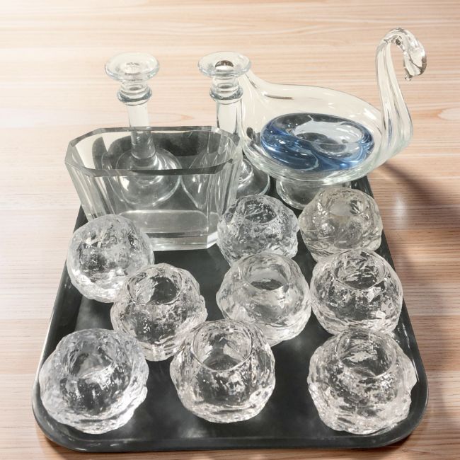 A collection of Scandinavian textured glass tea light holders, pair of candlesticks, bowl in the form of a swan, etc.