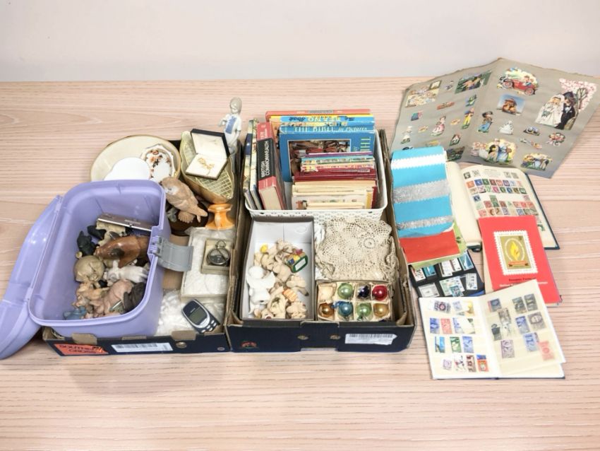 Miscellaneous wares including Piggin ornaments, vintage annuals, stamp album, scrap book, voltmeter, lace doilies, ceramics, costume brooch, etc. (2 boxes)