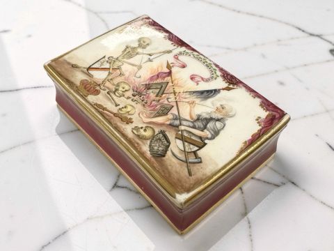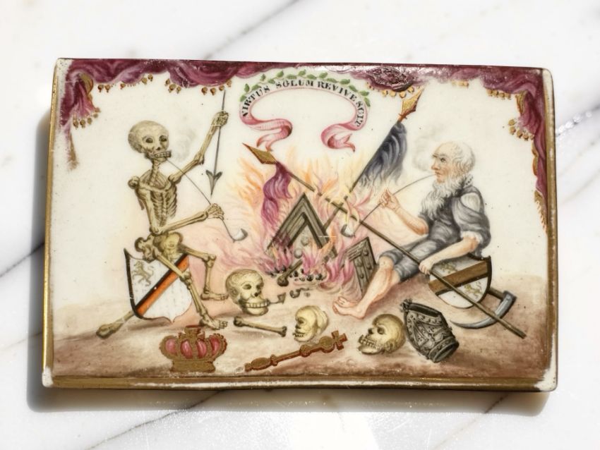 A porcelain box cover, 19th century, painted with a scene of an old man and a skeleton smoking pipes beneath the motto 'Virtus Solum Revive Scit' ('Virtue alone knows how to bring back life), width 12cm.