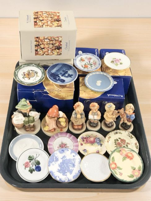 A collection of pin dishes including Wedgwood, Coalport, Royal Worcester, several Goebel figures of boys and girls, etc.