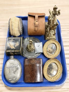 A pair of silver mounted brushes in leather travel pouch, an oval pewter hip flask bearing Third Reich Eagle and Swastika emblem, a Criterion Bakelite cigarette box, a Japanese lacquer export box, pair of small gilt framed oil paintings, brass figure of a falconer on horseback, etc.
