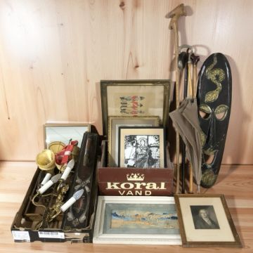 A group of pictures and prints, African wooden mask, walking sticks, umbrella, light fittings, mangleboard, etc.