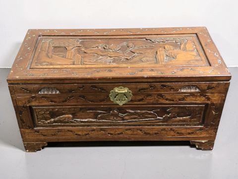 A 20th century Chinese carved camphor wood blanket chest, width 80 cm.