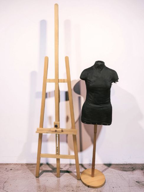 A wooden easel and a mannequin torso on stand.