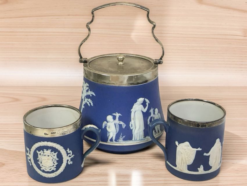 A Wedgwood jasperware EPNS mounted biscuit barrel, height 23 cm including swing handle, together with two Adams Tunstall jasperware mugs with silver mounts.