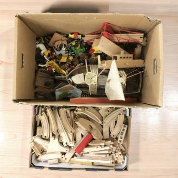 A collection of wooden and plastic toys and models, railway track, large model ship, etc. (2 boxes)