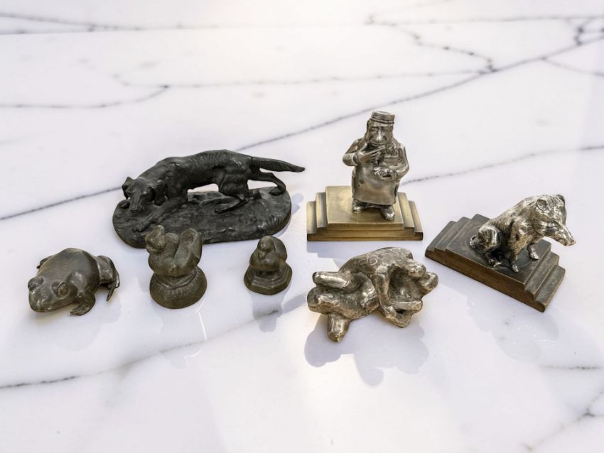 A group of various metal statues and figures, silvered figure of two lovers embracing, bronze figures of animals, etc, tallest 11cm.