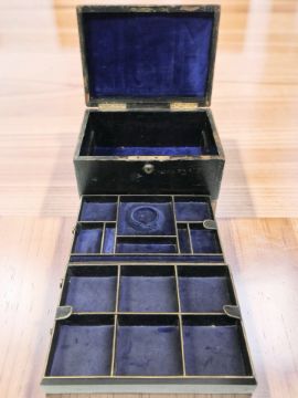 An antique jewellery box, pair of African hardwood busts, two further figures, an Indian bone inlaid box.