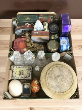 A group of tins, ostrich and emu eggs, circular foot stool, glass decanters, a plated vesta case, etc. (2 boxes)