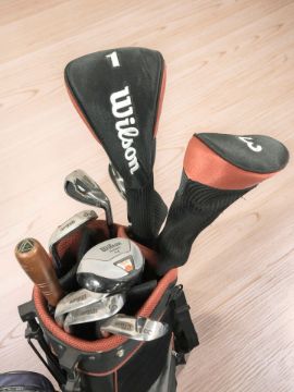 A Wilson golf bag containing irons and drivers, a box of golf balls and a Dunlop tennis racket.
