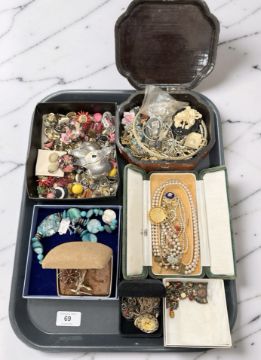A tray of costume jewellery, oriental lacquered box, chains, earrings, etc.
