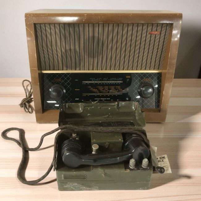 A vintage Murphy valve radio, width 48 cm and a military telephone. (2)