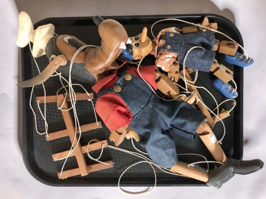 A jointed wooden Pinocchio puppet and a further Pluto the Dog puppet.