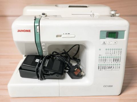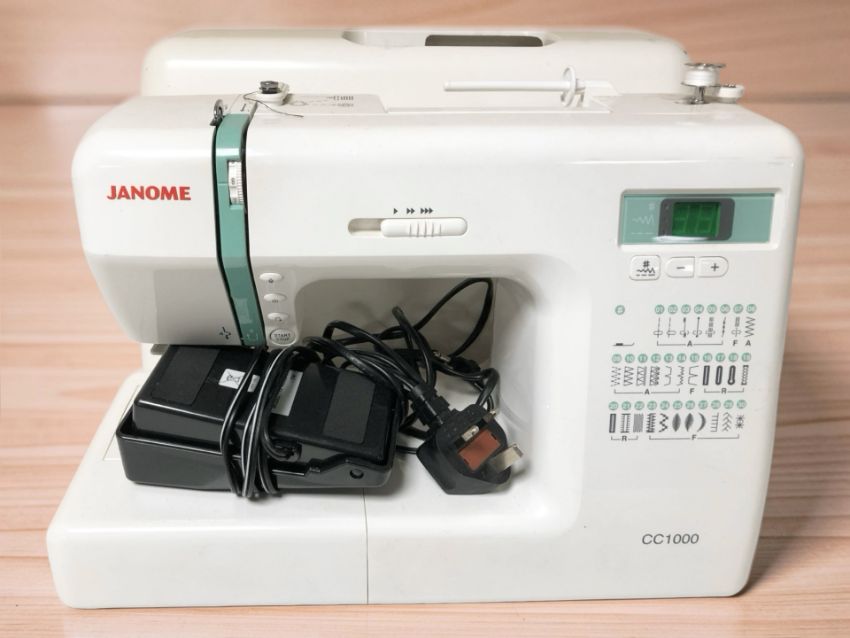 A Janome CC1000 digital sewing machine, with lead and pedal.