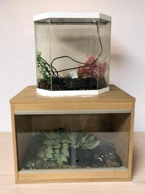 A vivarium, 58 cm x 39 cm x 43 cm, together with an aquarium.
