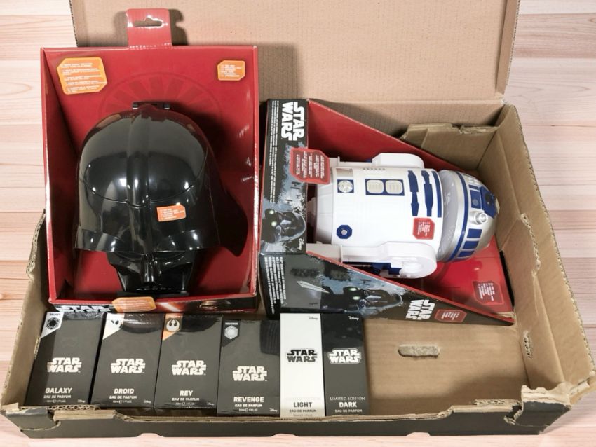 An Underground Toys Disney Star Wars R2-D2 figure and further Darth Vader helmet, and six Star Wars eau de parfums. (1 box)