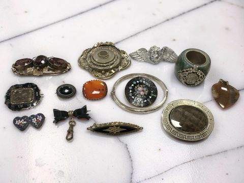 A group of Victorian pinchbeck brooches, silver bangle, brooches, etc