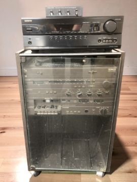 An Onkyo receiver TX-SR507 and a record cabinet containing a Team 31 De Luxe hi/fi system