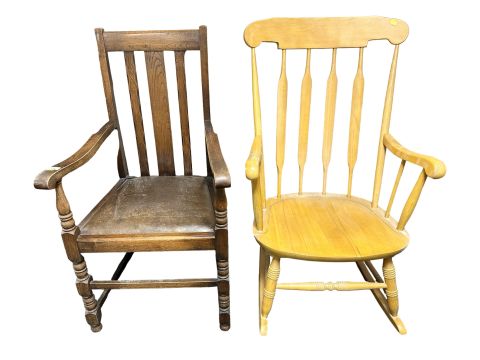 A pine spindle back rocking chair and an Edwardian oak armchair.