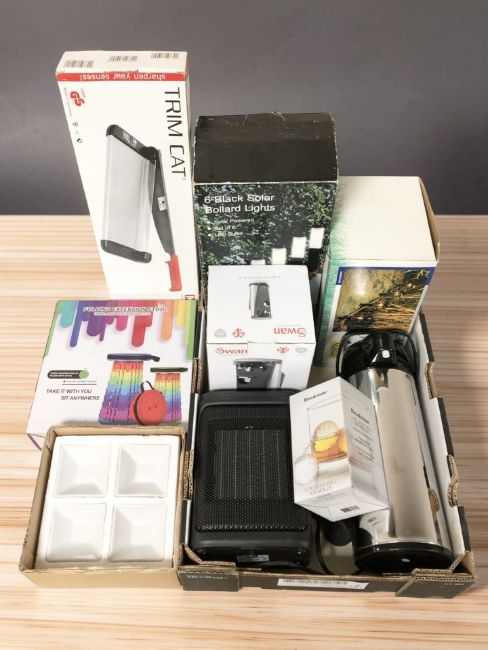 Assorted homewares including solar powered LED garden lights, a Swan electric can opener, small heater, etc. (1 box)