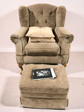 A contemporary Delcor wingback armchair and footstool, width 100 cm.