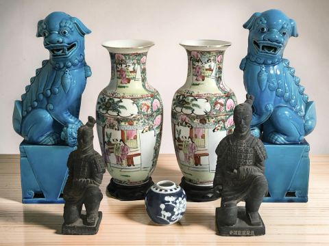 A group of oriental wares including a pair of porcelain baluster vases on wooden stands, height 29 cm, a pair of turquoise glaze foo dogs, terracotta warrior figures, etc.