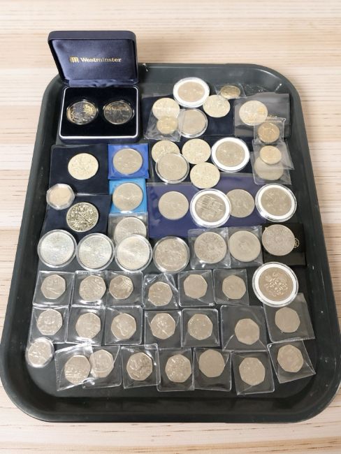 Approximately twenty one collector's fifty pence pieces including Beatrix Potter, four two pound coins, assorted crowns, etc.