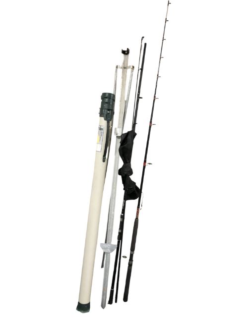 A Captor Dragon Carp 12' two-piece fishing rod, further rod, adjustable rod case and a metal rest