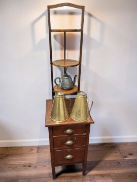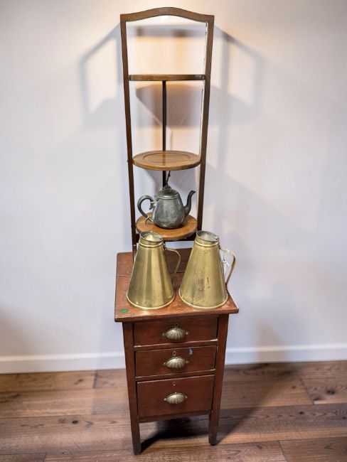 An Edwardian stained pine three drawer chest, width 43 cm, together with an inlaid mahogany cake stand, pewter teapot and two brass jugs