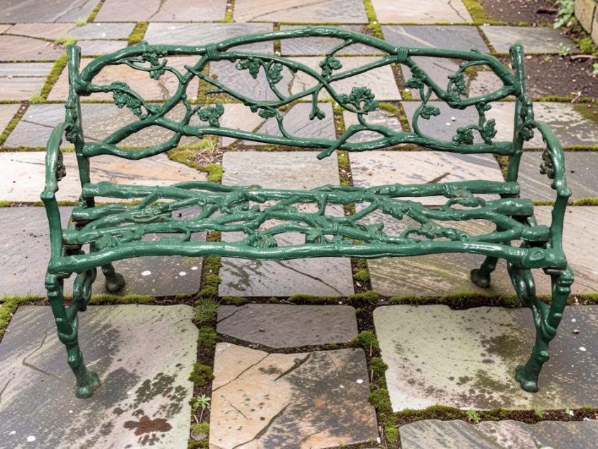 A painted cast iron naturalistic two seater garden bench, modelled as scrolling oak branches, 127 cm wide.