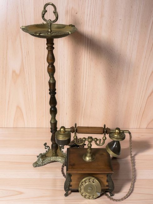 A beech and brass smoker's stand, height 67 cm, and a reproduction rotary telephone.