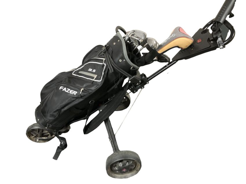 A Fazer golf bag on trolley containing Callaway Diablo Edge golf clubs.