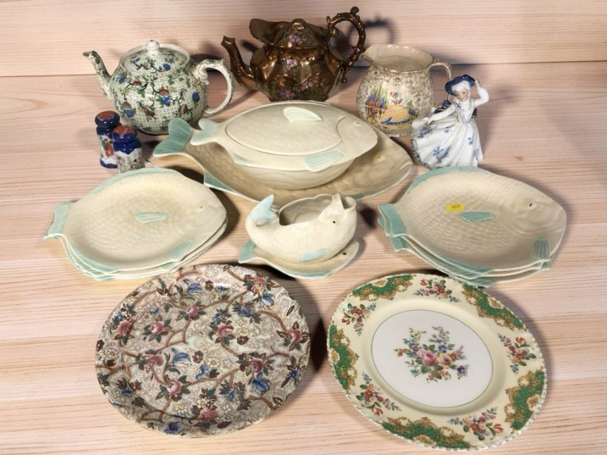 A group of Shorter & Sons fish table wares, Maling lustre plate, etc (one box)