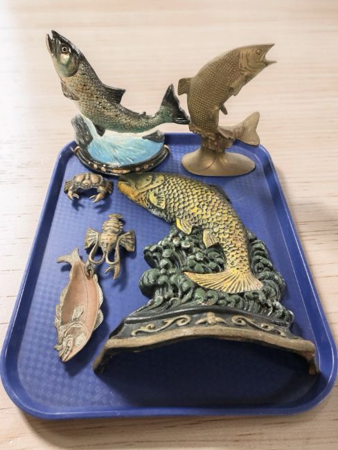 A group of metal fish and crustacean ornaments including a doorstop.
