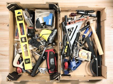 Assorted modern hand tools, a Rolson No. 4 woodworking plane, etc. (2 boxes)