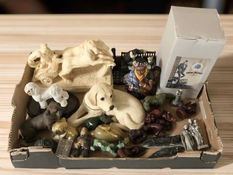 A group of Chinese resin ornaments, further figures of dogs, etc. (1 box)
